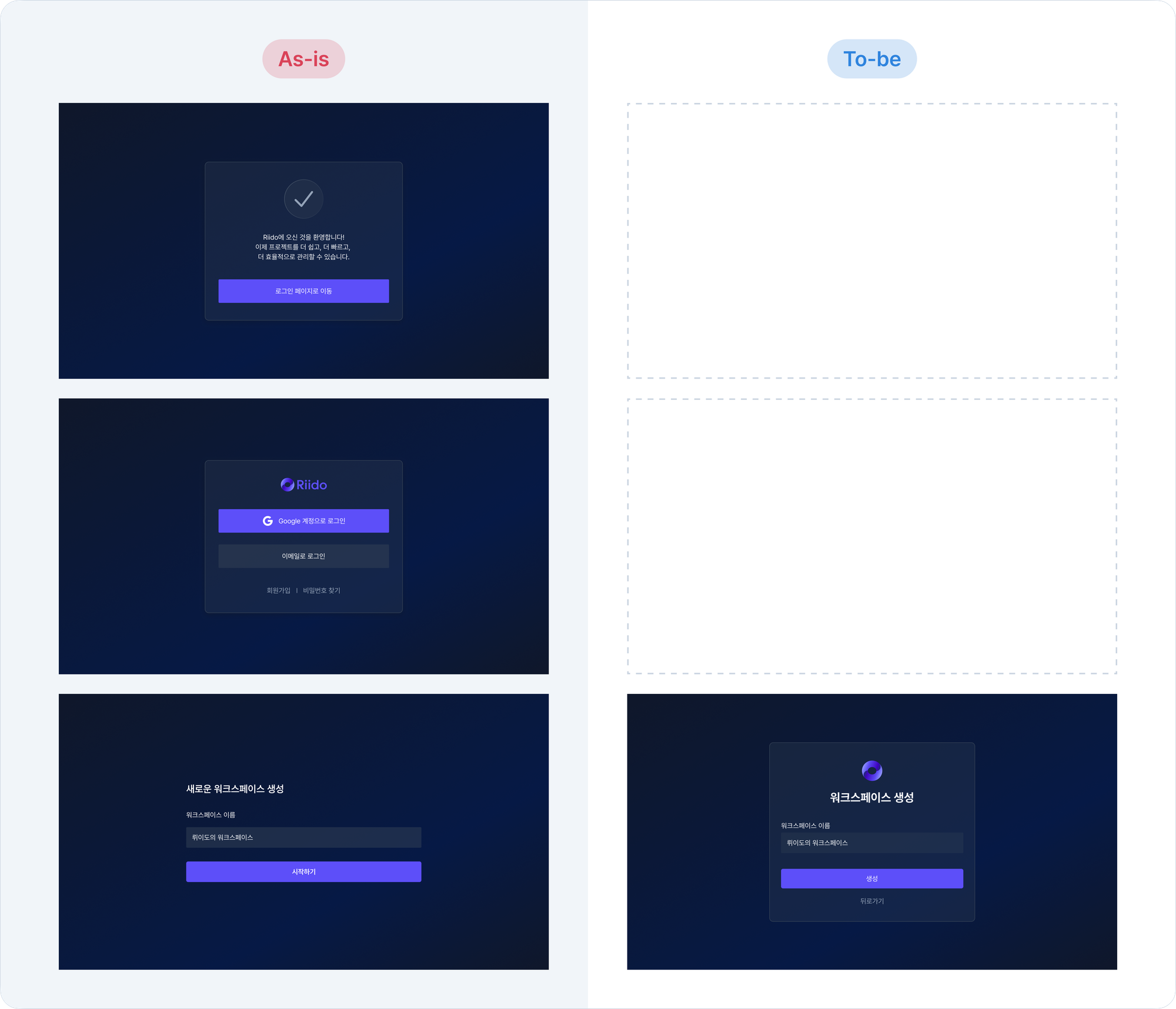 뤼이도는 가입 후 워크스페이스를 생성해야만 프로젝트 관리를 시작할 수 있습니다. 하지만 기존 플로우에서는 '가입 완료'라는 메시지가 모두 끝난 것처럼 느껴지게 만들었고, 실제로 워크스페이스를 생성하지 않은 채 이탈하는 사용자가 많았습니다.